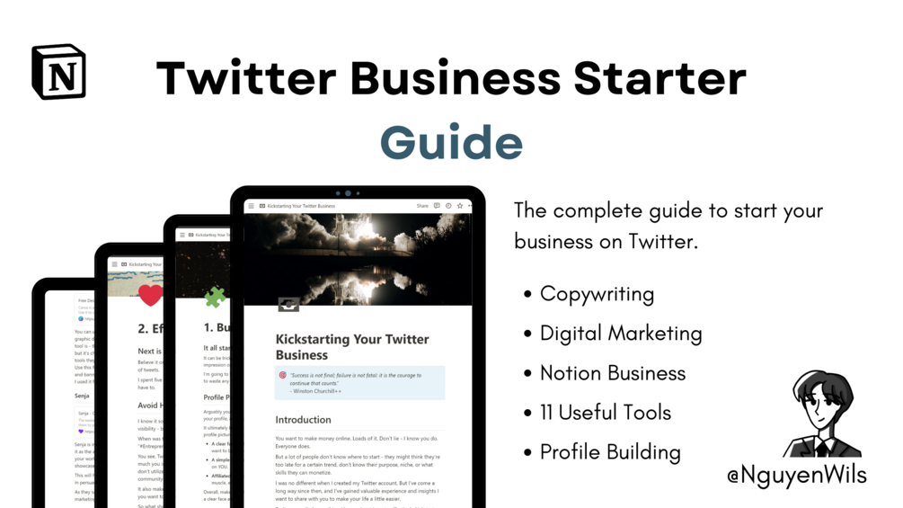 Included in this product is an introduction to copywriting, digital marketing, and using Notion to start earning money on Twitter. I go over things like profile optimization and engagement tactics, as well as provide examples and frameworks for you to follow. -